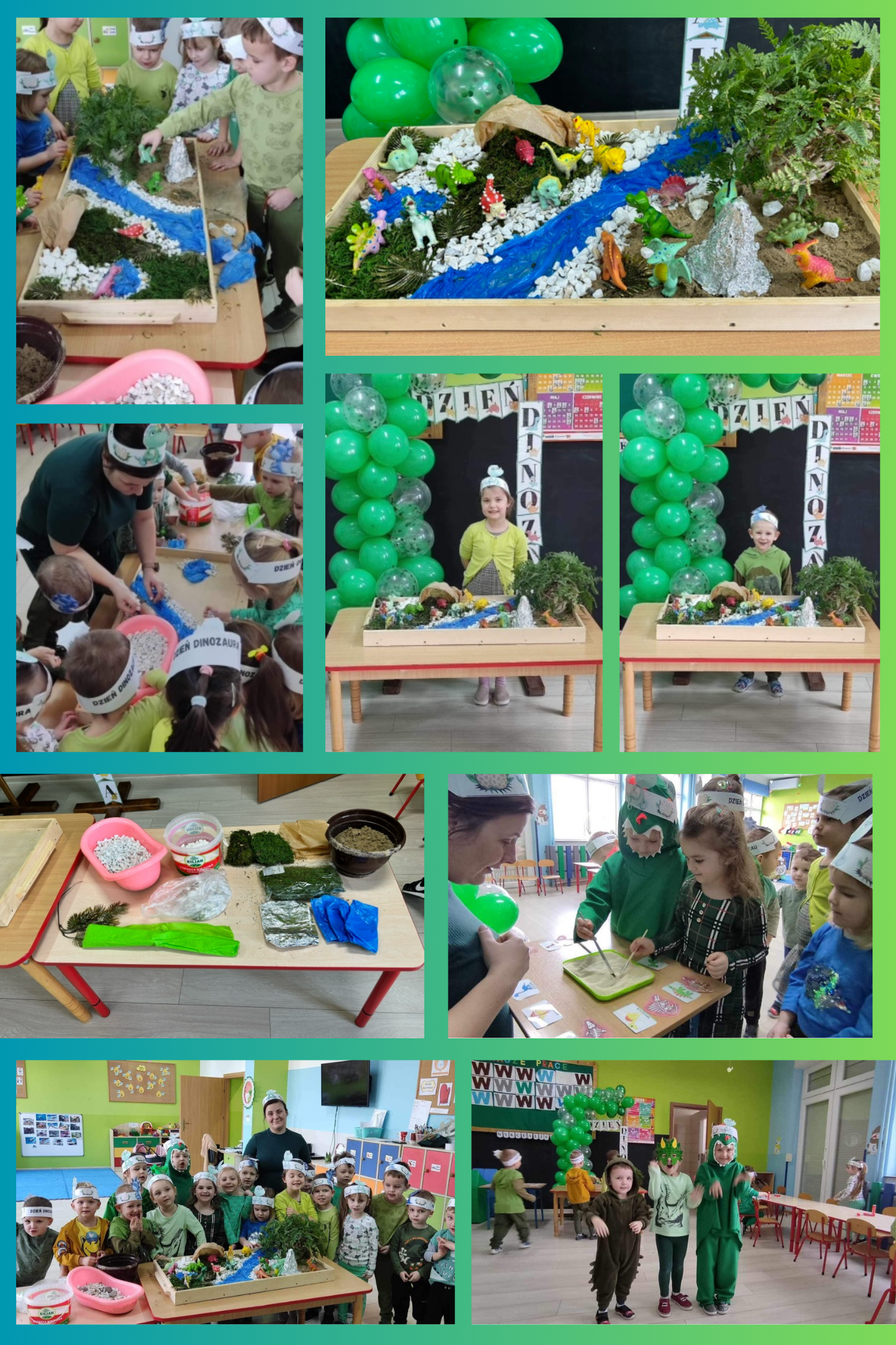 Dzisiaj przedszkolaki obchodziły dzień dinozaura. Wykonały makietę, przedstawiającą życie dinozaurów.