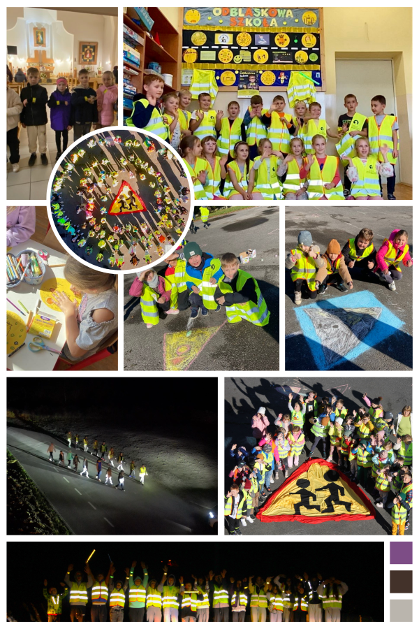 z dróg. Uczniowie 7 i 8 klasy brali udział w nagrywaniu wieczornych scen do filmu promującego noszenie odblasków i akcję “Odblaskowa szkoła”. Oczywiście wszyscy uczestnicy tej eskapady założyli kamizelki odblaskowe. Uczniowie szkoły wraz z Panią dyrektor, Księdzem, nauczycielami, rodzicami, oraz mieszkańcami 25 października uczestniczyli w wyjątkowej modlitwie różańcowej. Dzieci i młodzież zebrali się w kościele, aby modlić się w intencji wszystkich pieszych, aby bezpiecznie przemieszczali się po drogach w szczególnie porą wieczorną. Uczniowie przygotowujący się w tym roku do Komunii Świętej rozdawali wszystkim chętnym opaski odblaskowe po zakończeniu modlitwy. Uczniowie 4 i 5 klasy wykonali plakaty promujące bezpieczeństwo na drodze, prace wystawiono na korytarzu szkolnym, aby przypominały o tym, jak ważne jest noszenie elementów odblaskowych. Odbył się również konkurs plastyczny dla dzieci z klas 1-3 związany z bezpieczeństwem podczas poruszania się po drodze.