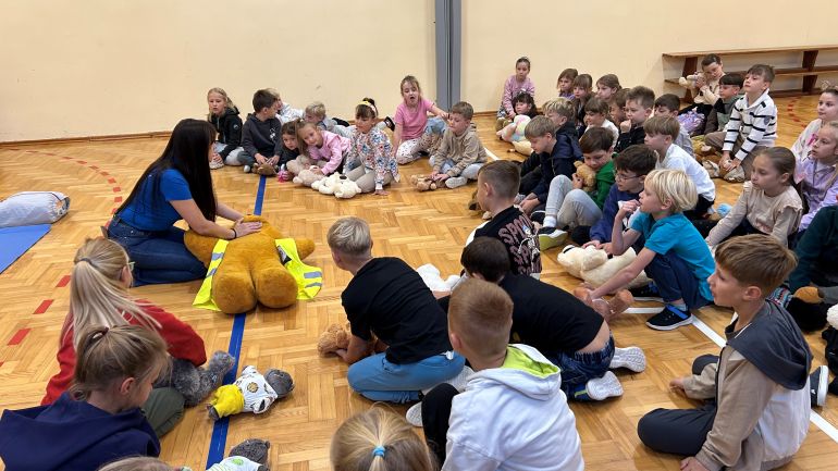 Dnia 7 października 2025 r. odbyły się w naszej szkole warsztaty udzielania pierwszej pomocy pt. „Smyk Ratownik”. W zajęciach uczestniczyły dzieci z klas 1–3, a także młodsze przedszkolaki i zerówka.