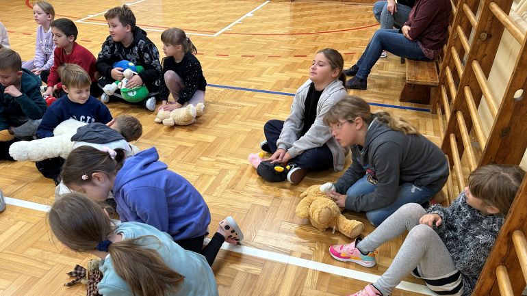 Dzieci z dużym zaangażowaniem brały udział w części praktycznej. Każdy uczestnik przyniósł swojego misia, na którym mógł ćwiczyć udzielanie pomocy. Zajęcia były nie tylko bardzo interesujące, ale też niezwykle pożyteczne.