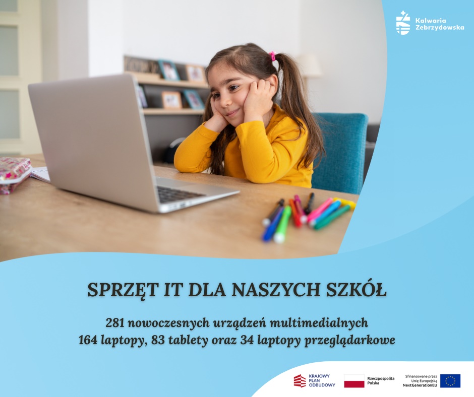 W ramach ogólnopolskiego programu „Wyrównanie poziomu wyposażenia szkół w przenośne urządzenia multimedialne”, finansowanego z Krajowego Planu Odbudowy i Zwiększania Odporności (KPO), szkoły na terenie Gminy Kalwaria Zebrzydowska zostaną wyposażone łącznie w 281 nowoczesnych urządzeń multimedialnych – 164 laptopy, 83 tablety oraz 34 laptopy przeglądarkowe.