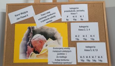 W naszej szkole odbył się trzeci etap szkolnego konkursu o naszym patronie pt. „Nie przeminiesz cały”. Konkurs był poświęcony życiu i działalności Karola Wojtyły – Jana Pawła II.